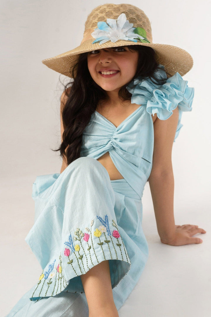 Blue jumpsuit with frill detailing at the shoulder, cutout at the waist and floral hand embroidery at the hem.