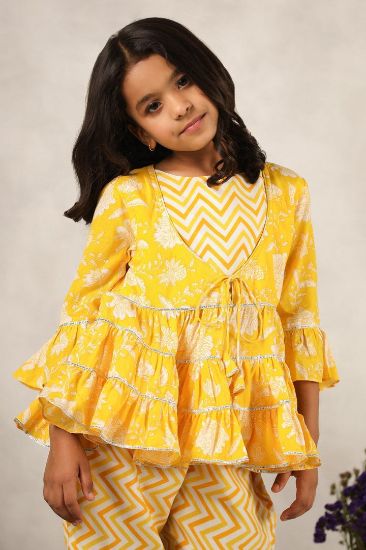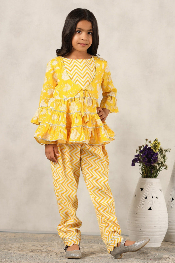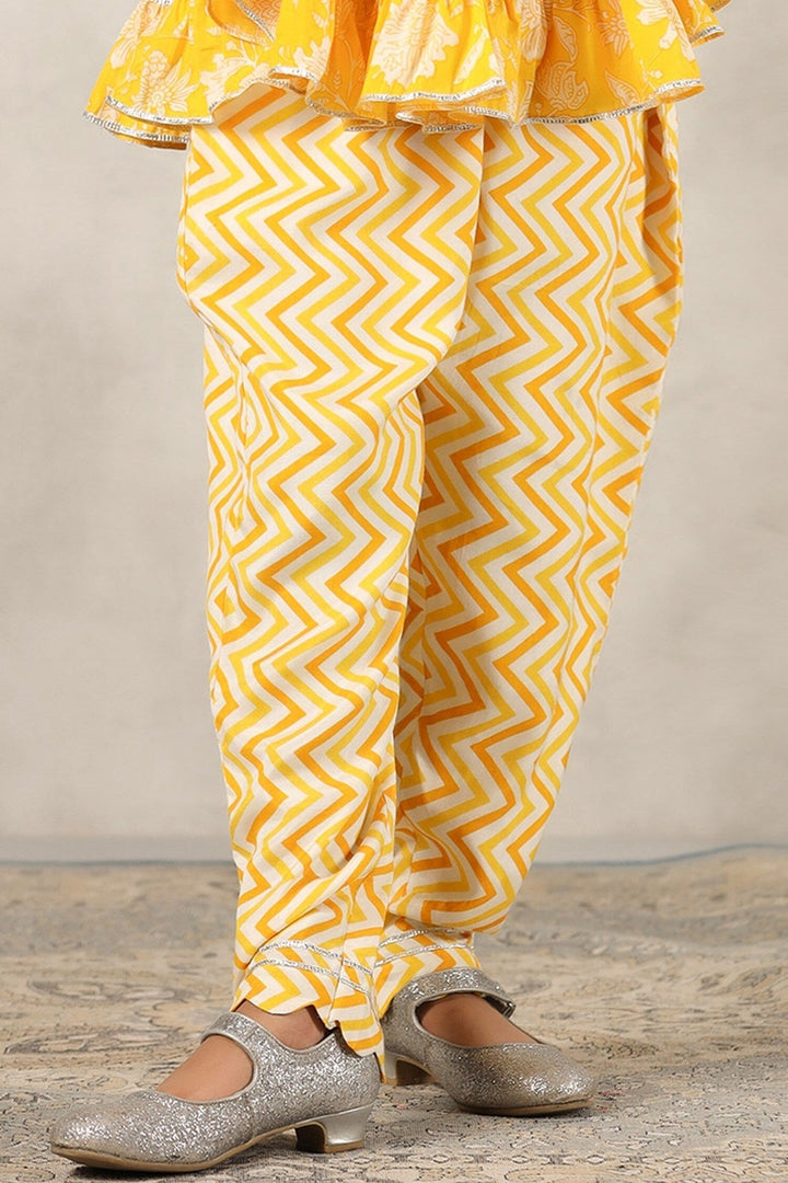 Yellow Zig Zag Print Jacket And Pant Set For Girls
